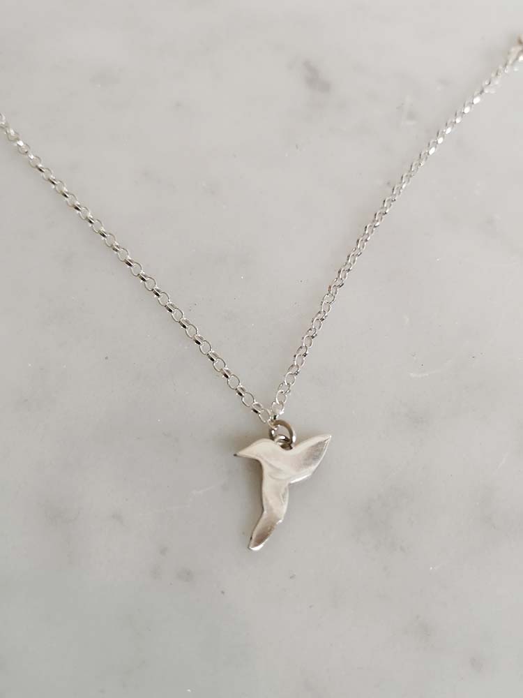 Pulsera con fina cadena rolo y colibrí en plata.